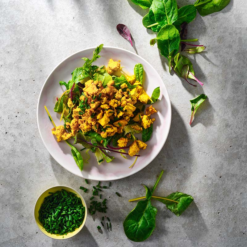 En underbar guld-gul vegansk ”äggröra” som är lika lätt att göra som god att äta
