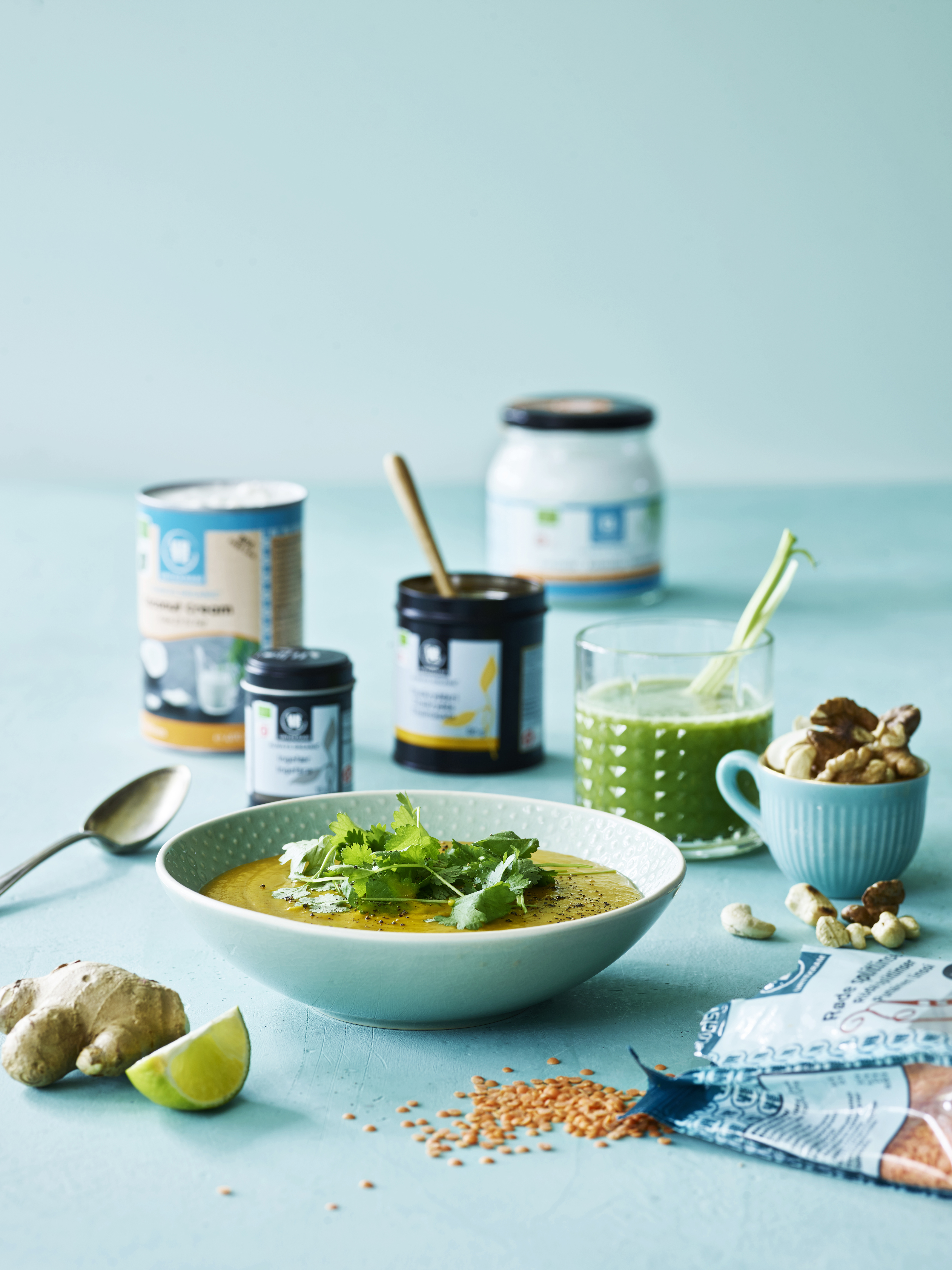 Hacka vitlök och ingefära. Smält kokosoljan i en gryta och tillsätt vitlök, ingefära, thaikryddor och mald koriander. Stek på medelhög värme i 3-5 minuter. Häll i kokosgrädden, vatten och buljongtärningar, låt koka upp. Tillsätt linserna och låt soppan koka i 20 minuter.