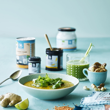 Hacka den färska koriandern grovt. När pumpan och löken är klara i ugnen hälls de ner i soppan. Smaka av med limesaft.